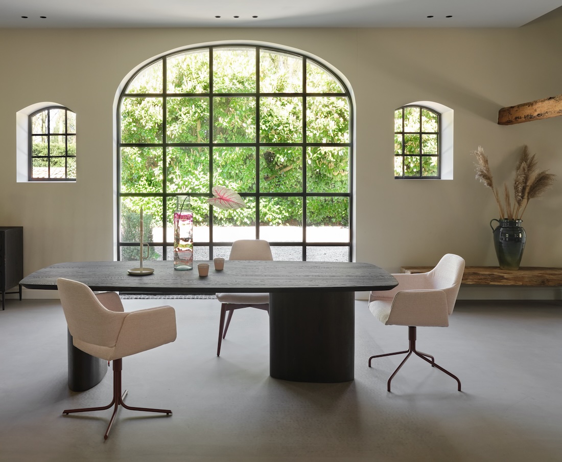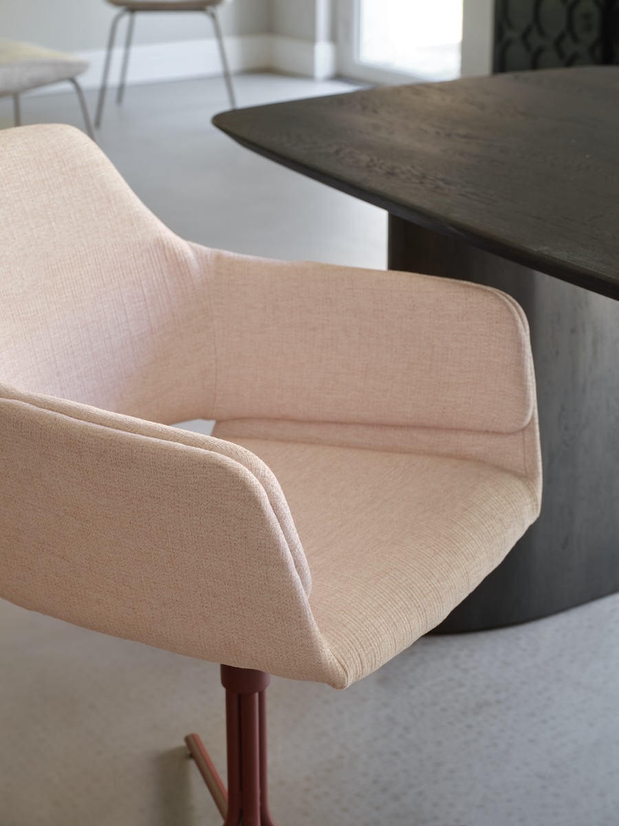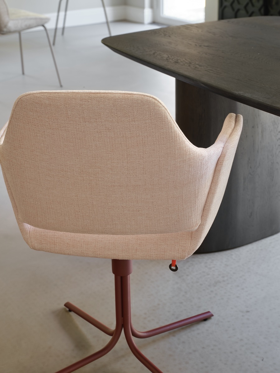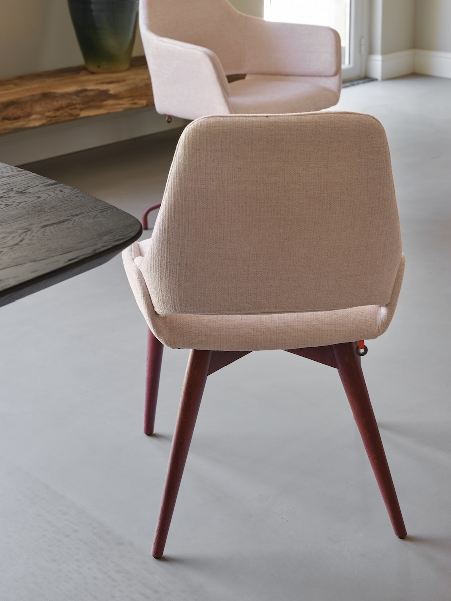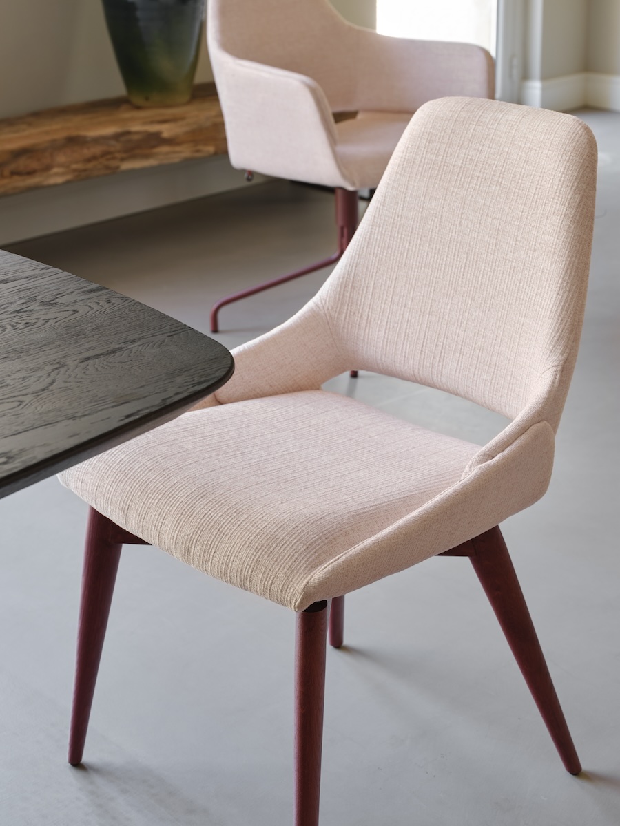 Eetkamerstoel Lotus van Mobitec is een stijlvol slank design. Zijn uitnodigende schelp belooft een uitstekend zitcomfort en heeft de uitstraling van een bloem in bloei. Dit fantastische ontwerp is mogelijk met- en zonder arm. Er kan gekozen worden voor een DUO-stoffering. Verschillende onderstellen in zowel hout als metaal. Ieder onderstel leverbaar in veel kleuren. Tevens kan het onderstel draaibaar worden gekozen. Prijs met arm is vanaf € 449,-, zonder arm vanaf € 399,-.
