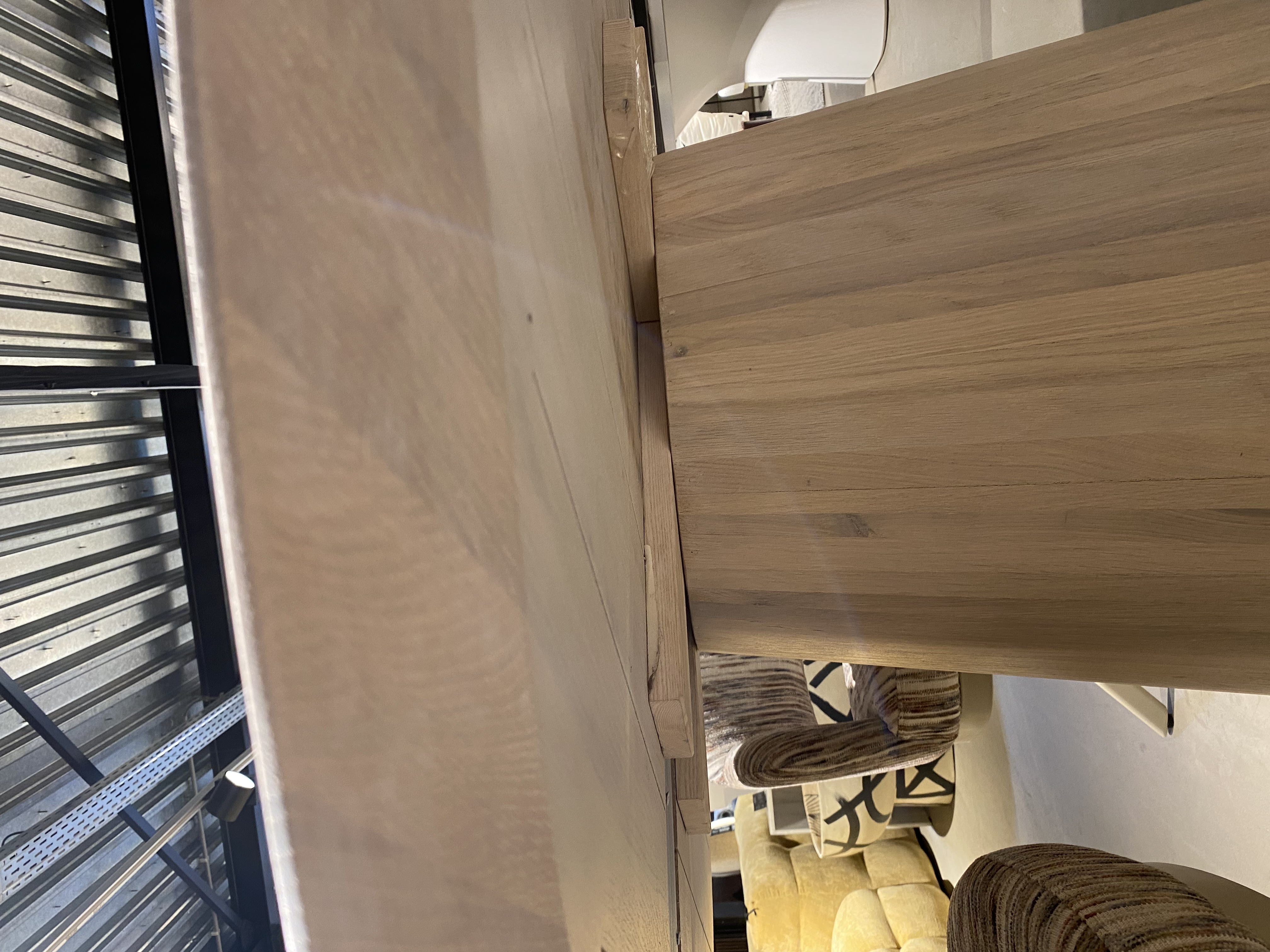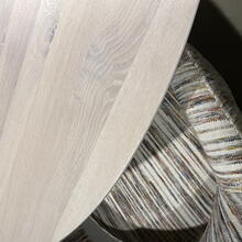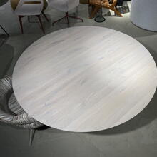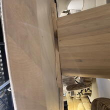 Uitgevoerd in massief eiken in blanke lak, kleur CBM 331 met zuilpoot 732 en facetrand van 22 gr.