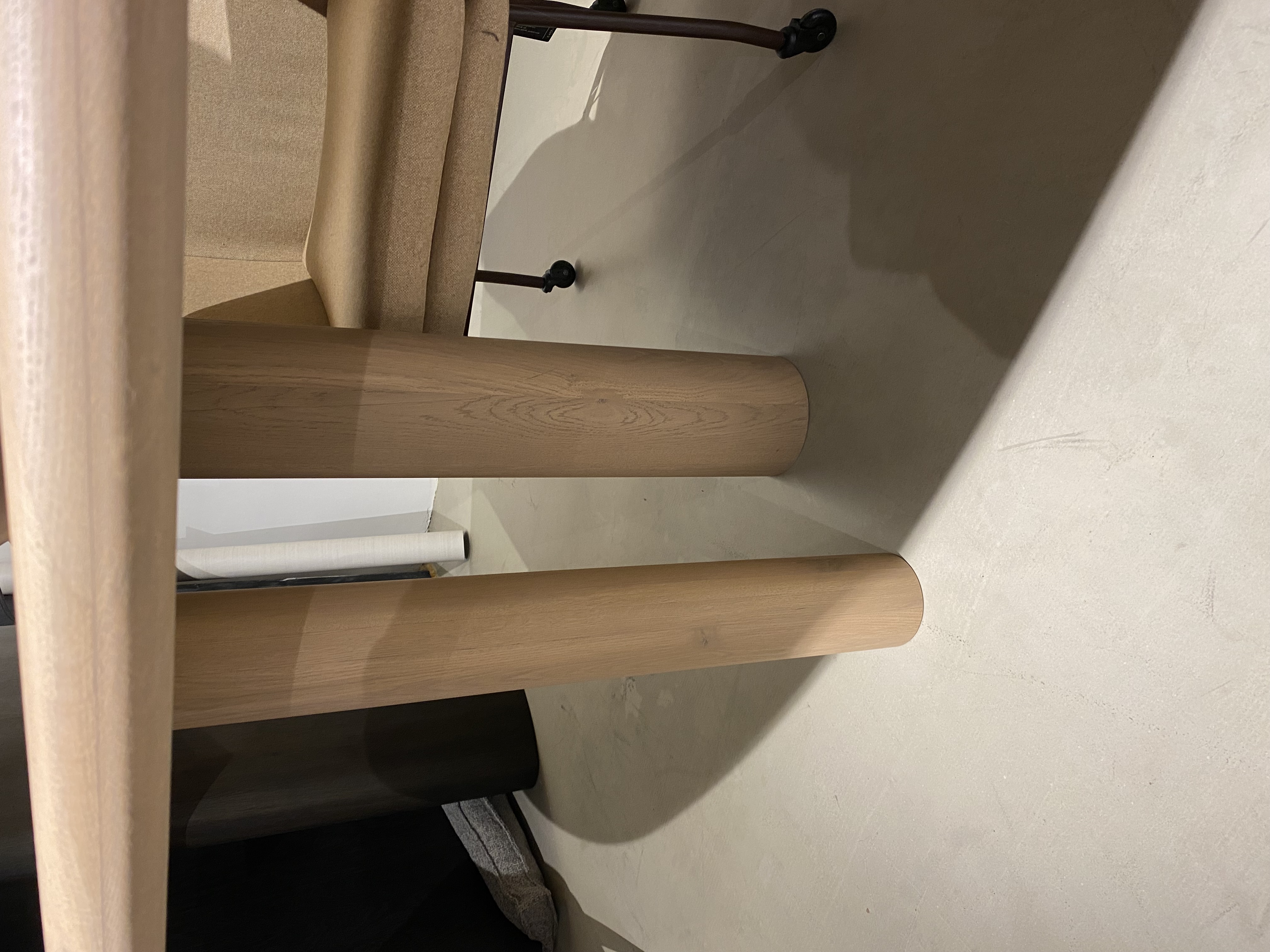 Uitgevoerd in massief eiken, 4 cm. opdik met bolle facetrand en zuilen onderstel type 742.