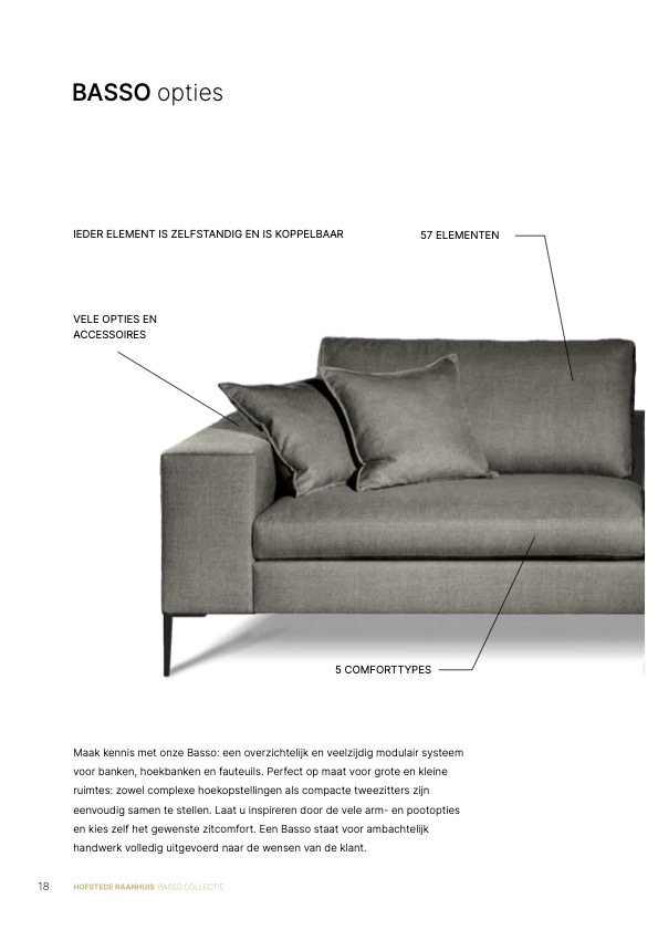 Bij Melchior Interieur zorgen we ervoor dat je met ieder model veel keuze hebt met betrekking tot alle mogelijkheden die er zijn. Model Basso gaat hierbij nog een heel stuk verder. Dit ontwerp kun je vergelijken met een semi-maatpak; we passen de bank perfect aan op jouw wensen. Behave alle standaardopties die we bij Melchior Interieur kennen, kun je bij model Basso ook een beetje hoger of lager. Dieper of ondieper. Zachter of harder zitcomfort. En zo gaat het nog wel even door, zie overzichtsknop voor een aantal opties.