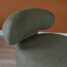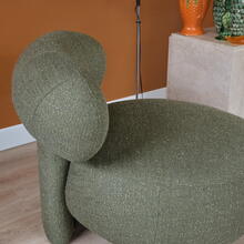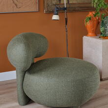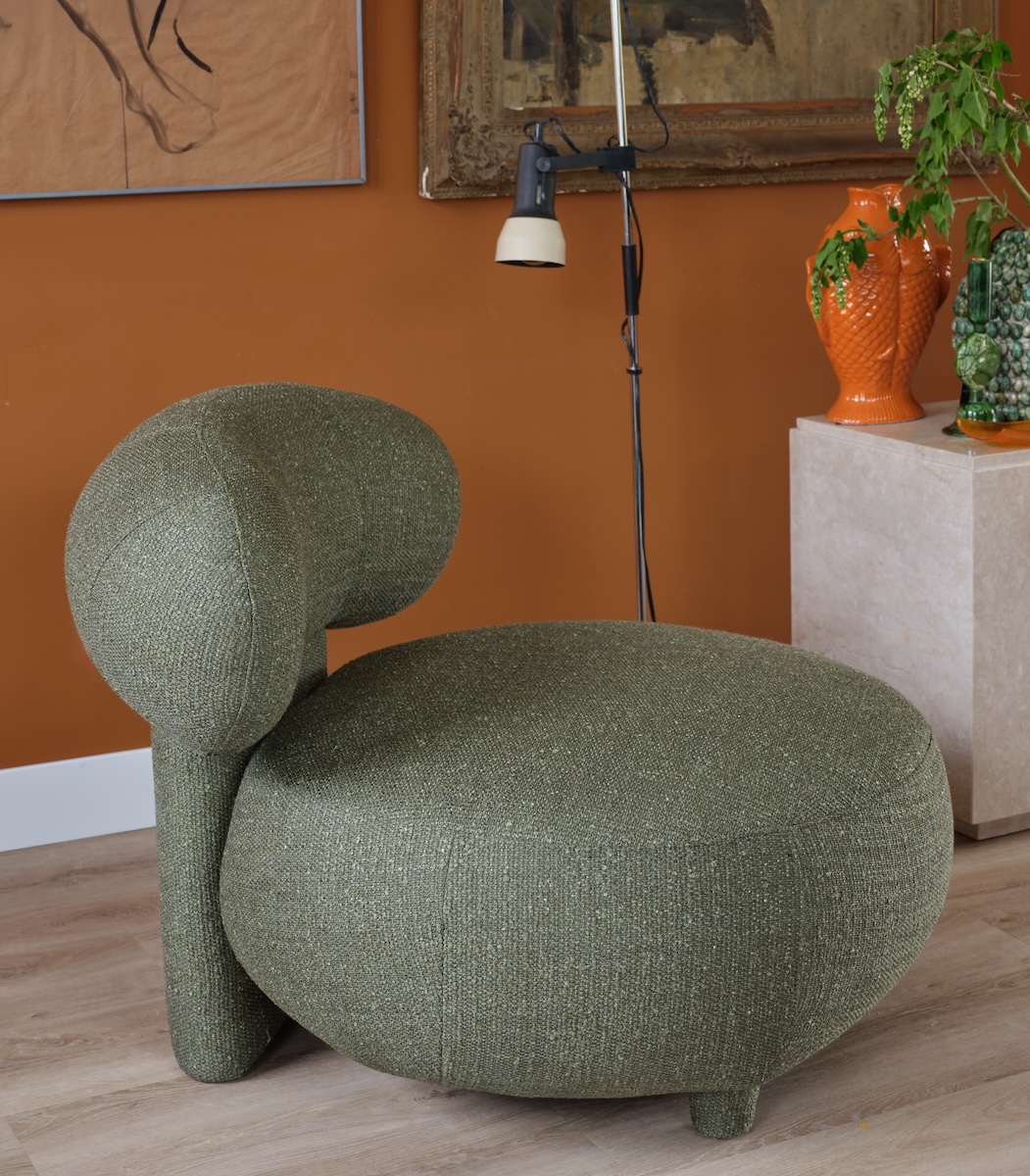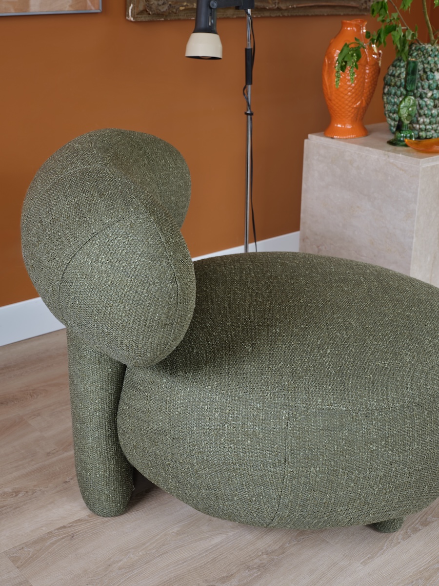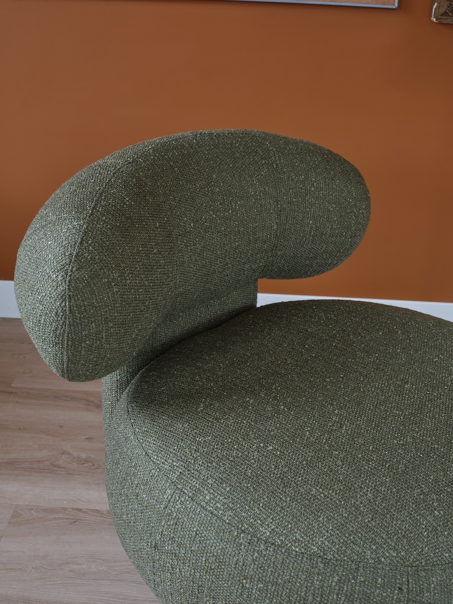 Maak kennis met deze onweerstaanbare blikvanger: een speels en stijlvol fauteuiltje dat comfort en design perfect weet te combineren. De organische vormgeving, met z’n afgeronde zit en sculpturale rugleuning, nodigt uit tot ontspannen – of je nu een boek leest, een goed gesprek voert of gewoon even helemaal niets doet. De diepgroene stoffering heeft een rijke textuur en voelt zacht aan, terwijl de compacte vorm het stoeltje ideaal maakt voor kleinere ruimtes. Leverbaar in meer dan 800 stoffen.