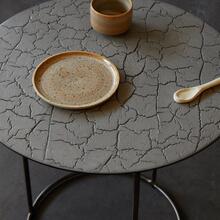 De collectie van Ethnicraft wordt verrijkt met deze prachtige aardse bijzettafel, die volgens enkele van de oudste artistieke technieken met de hand wordt gevormd door bekwame ambachtslieden. Door een groot deel metaalpoeder met water, aarde, natuurlijke minerale poeders en kleurpigmenten te mengen, krijgt dit bijzettafeltje zijn unieke textuur en aardse tint. Verkrijgbaar in de kleuren zwart, taupe en 'Whisky' en is uitgebracht in de uitvoering 'Lava’ en ‘Lava Linear’, waarbij in de laatstgenoemde uitvoering in een deel van het tafelblad groeven zijn gemaakt.