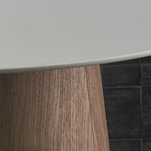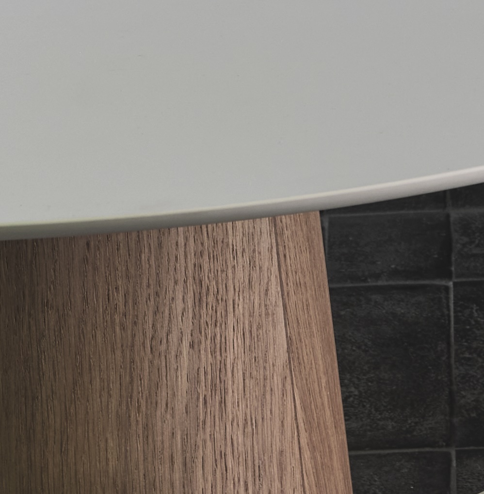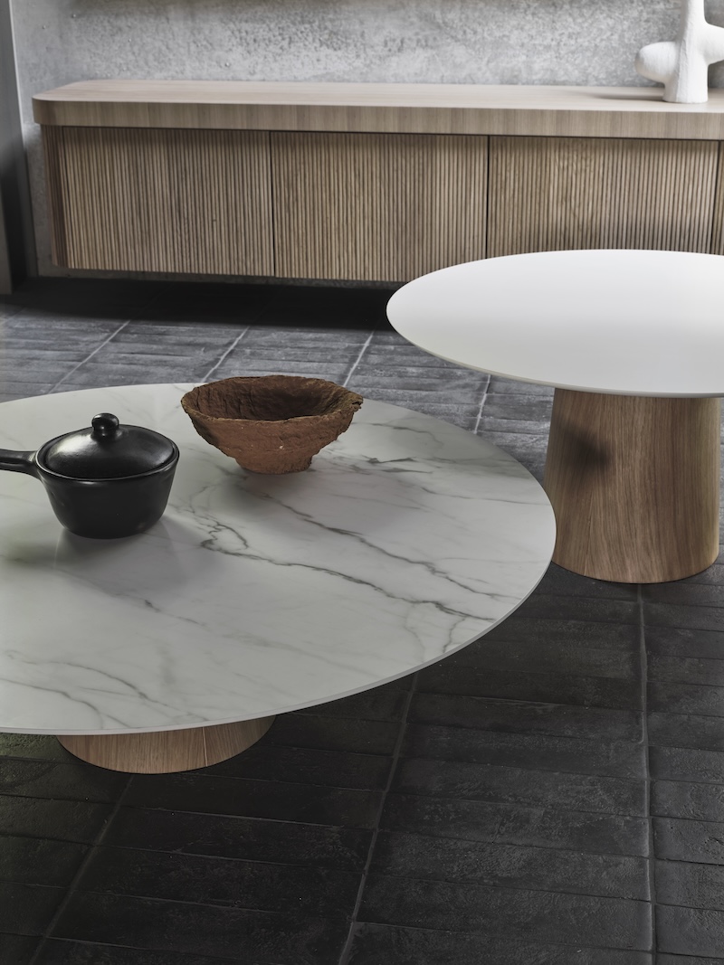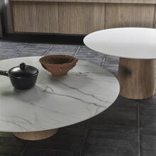 Italiaanse verfijning met een sterk ruimtelijk effect. De Mush salontafel van Imperial Line is een waanzinnig mooie serie waarbij je jouw eigen tafel helemaal naar wens kunt samenstellen. Heel mooi als stand-alone of juist met z'n tweeën zoals wij deze hebben gepresenteerd. De diameter, de hoogte, kleur & type blad en materiaal en kleur voor het onderstel. Op de foto is de grote (€ 1.653,-) tafel voorzien van een keramiek blad, de kleinere (€1.184,-) tafel heeft een HPL-top.